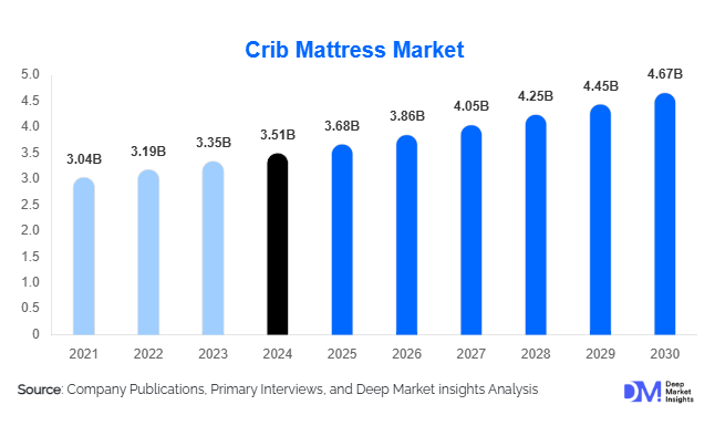According to Deep Market Insights, the global Crib Mattress Market size is projected to grow from USD 3.68 Billion in 2025 to reach USD 4.67 Billion by 2030, expanding at a CAGR of 4.88% during the forecast period (2025–2030).