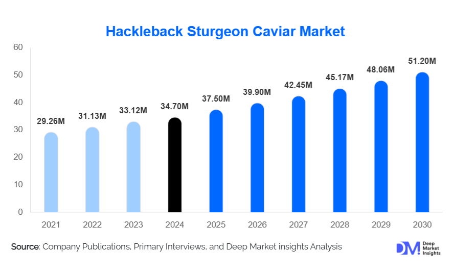 According to Deep Market Insights, the global Hackleback Sturgeon Caviar Market size is projected to grow from USD 37.5 Million in 2025 to reach USD 51.2 Million by 2030, expanding at a CAGR of 6.4% during the forecast period (2025–2030).