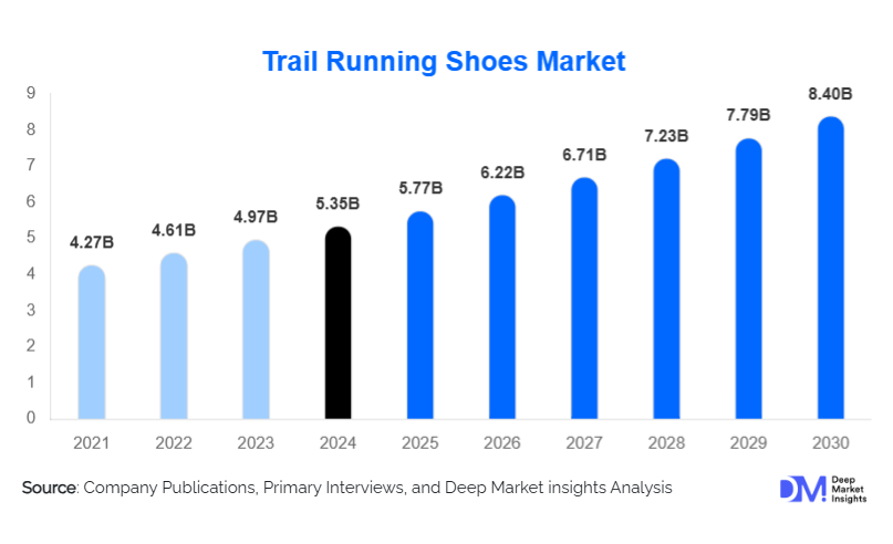 According to Deep Market Insights, the global Trail Running Shoes Market size is projected to grow from USD 5.77 Billion in 2025 to reach USD 8.4 Billion by 2030, expanding at a CAGR of 7.8% during the forecast period (2025–2030).