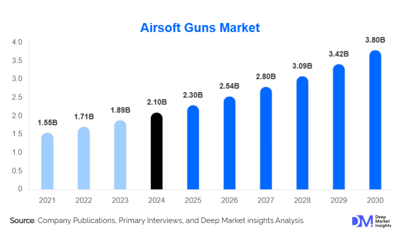 According to Deep Market Insights, the global Airsoft Guns Market size is projected to grow from USD 2.3 Billion in 2025 to reach USD 3.8 Billion by 2030, expanding at a CAGR of 10.4% during the forecast period (2025–2030).