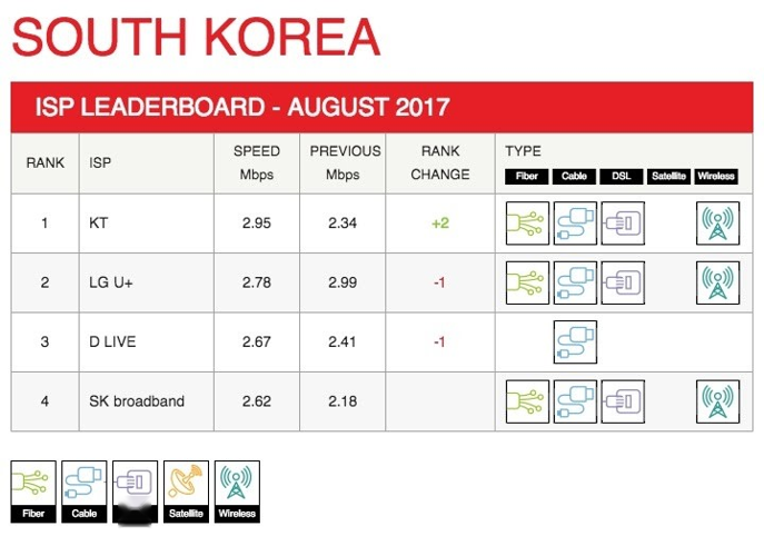 South Korean providers made remarkable progress this month, with the country jumping ten positions to reach 40th place globally. This impressive climb was primarily driven by substantial improvements from two major ISPs: KT and SK Broadband. KT achieved a significant speed increase of 0.61 Mbps, bringing their monthly average to 2.95 Mbps compared to July's 2.34 Mbps. Similarly, SK Broadband improved from 2.18 Mbps to 2.62 Mbps.
