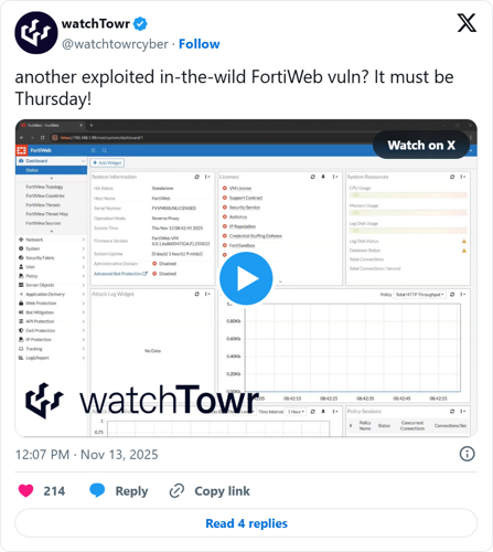Testing conducted by Rapid7 has confirmed that the vulnerability impacts FortiWeb deployments running version 8.0.1 and earlier builds. A remediation patch addressing this security flaw was implemented in version 8.0.2, which reportedly became available in late October.