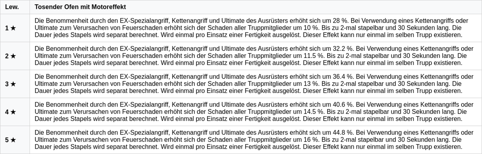 Bei Auslösung eines Kettenangriffs oder Ultimativen, der Feuerschaden verursacht, erhöht sich der Schaden aller Truppmitglieder um 10 %.