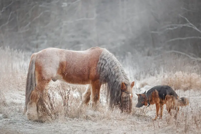 Взаємодія собаки і коня базується на взаємній адаптації. Кінь, як правило, спочатку насторожено реагує на собаку, адже це потенційно невідомий хижак. Однак німецька вівчарка завдяки своєму спокійному характеру швидко знижує напругу.