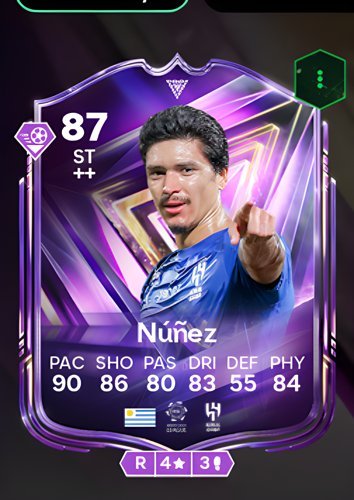 Darwin Núñez's FC Pro card presents him as a formidable Striker, boasting an impressive overall rating of 87. With standout attributes such as a blistering 90 pace, powerful 86 shooting, and solid 84 physicality, Núñez is equipped to dominate the front line. His 83 dribbling and 80 passing further enhance his versatility, allowing him to maneuver through tight defenses and link up effectively with teammates. As a striker, this card offers a sharp attacking threat, enabling players to swiftly break through opposing defenses and capitalize on scoring opportunities, making Núñez an invaluable asset for sealing victories in any match.