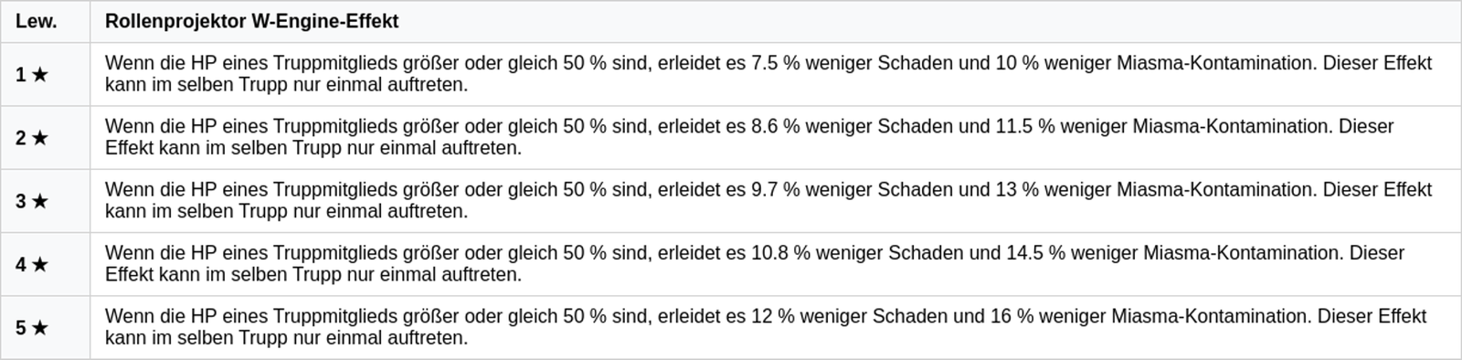 Bei über 50% Lebenspunkten erhalten Teammitglieder Schadensreduzierung und verbesserten Miasma-Widerstand.