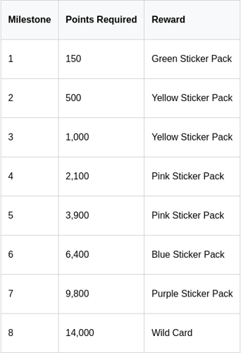 Below, find a complete overview of all the milestones and their corresponding sticker-filled rewards, presented across two pages.