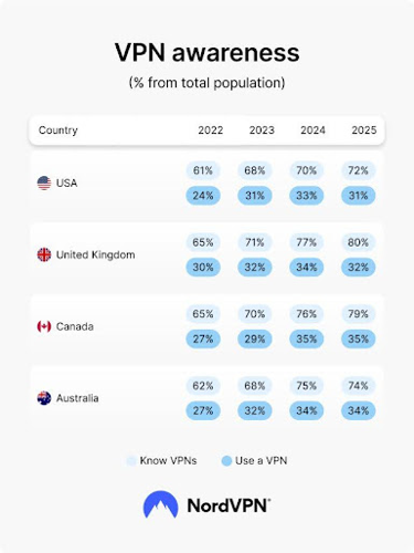 According to data collected in August, approximately 12% of British VPN users still utilize free services. This trend persists even though general knowledge about VPNs has reached an impressive 80% among UK residents—surpassing awareness levels in several other major English-speaking countries including the United States, Canada, and Australia.
