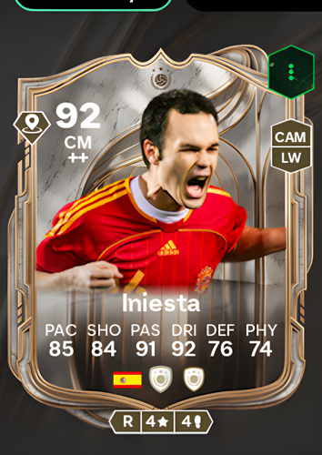 Andrés Iniesta Luján's Icon card stands out as a highly coveted Center Midfielder, boasting an impressive overall rating of 92. With a pace rating of 85 and dribbling at 92, Iniesta offers exceptional agility and close control, allowing him to glide past opponents in tight spaces. His passing attribute of 91 ensures pinpoint distribution, making him the creative heartbeat of any midfield, while his shooting rating of 84 means he’s more than capable of contributing crucial goals from deeper positions. Although his defense (76) and physicality (74) are not his strongest suits, his technical prowess and vision make this card a game-changer—perfect for orchestrating attacks, maintaining possession, and unlocking defenses with ease, giving you the upper hand in critical moments on the pitch.